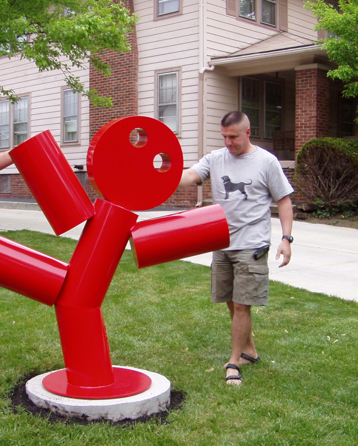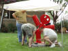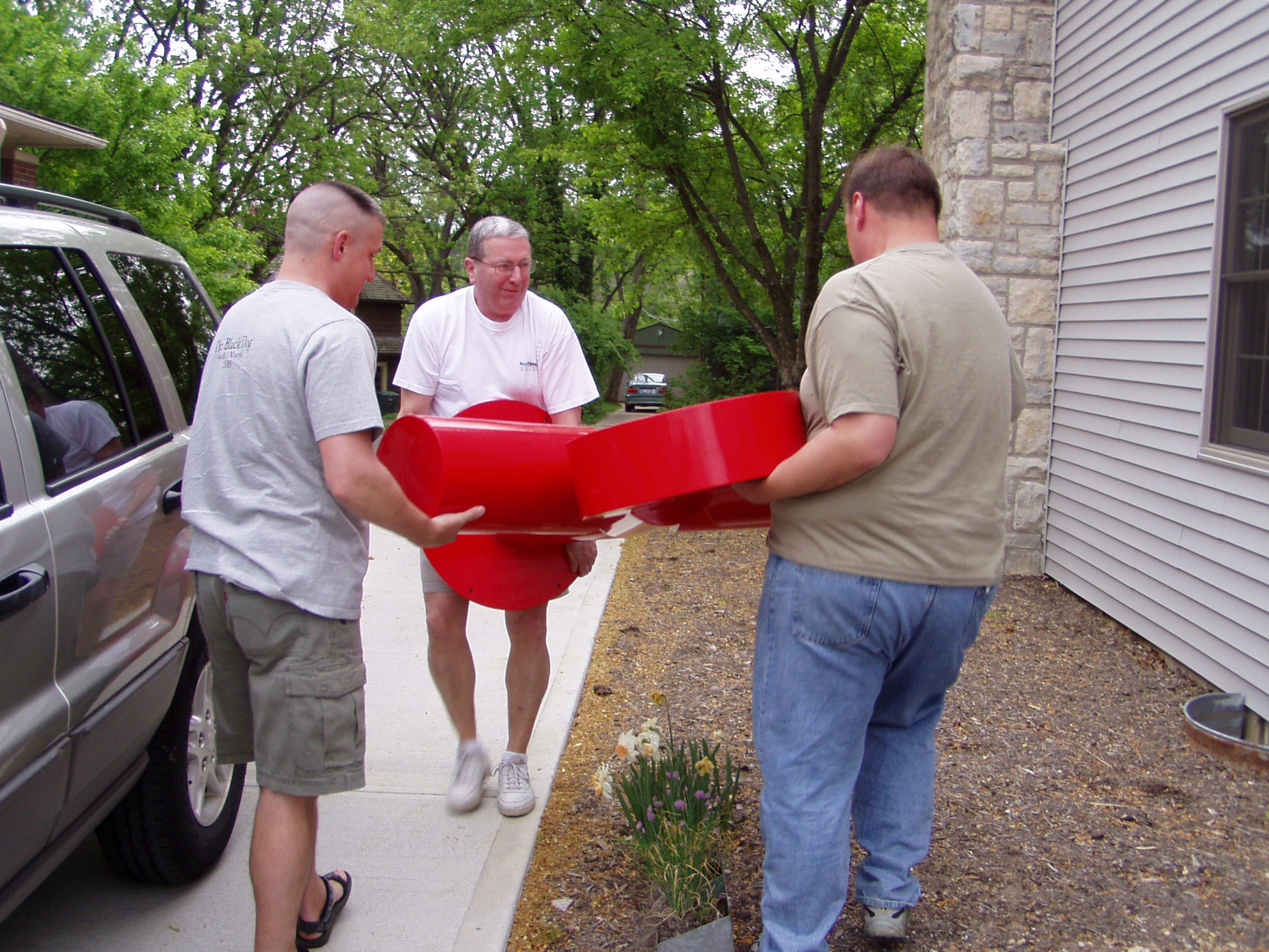 "Uncle Kirk," on the left, and "Grandpa," Bill Radford (center, facing camera) were the engineering brains behind providing a secure base for Fat Happy. On May 14, 2005, Grandpa and Uncle Kirk came to finish the job and help me secure Fat Happy in his permanent location. |