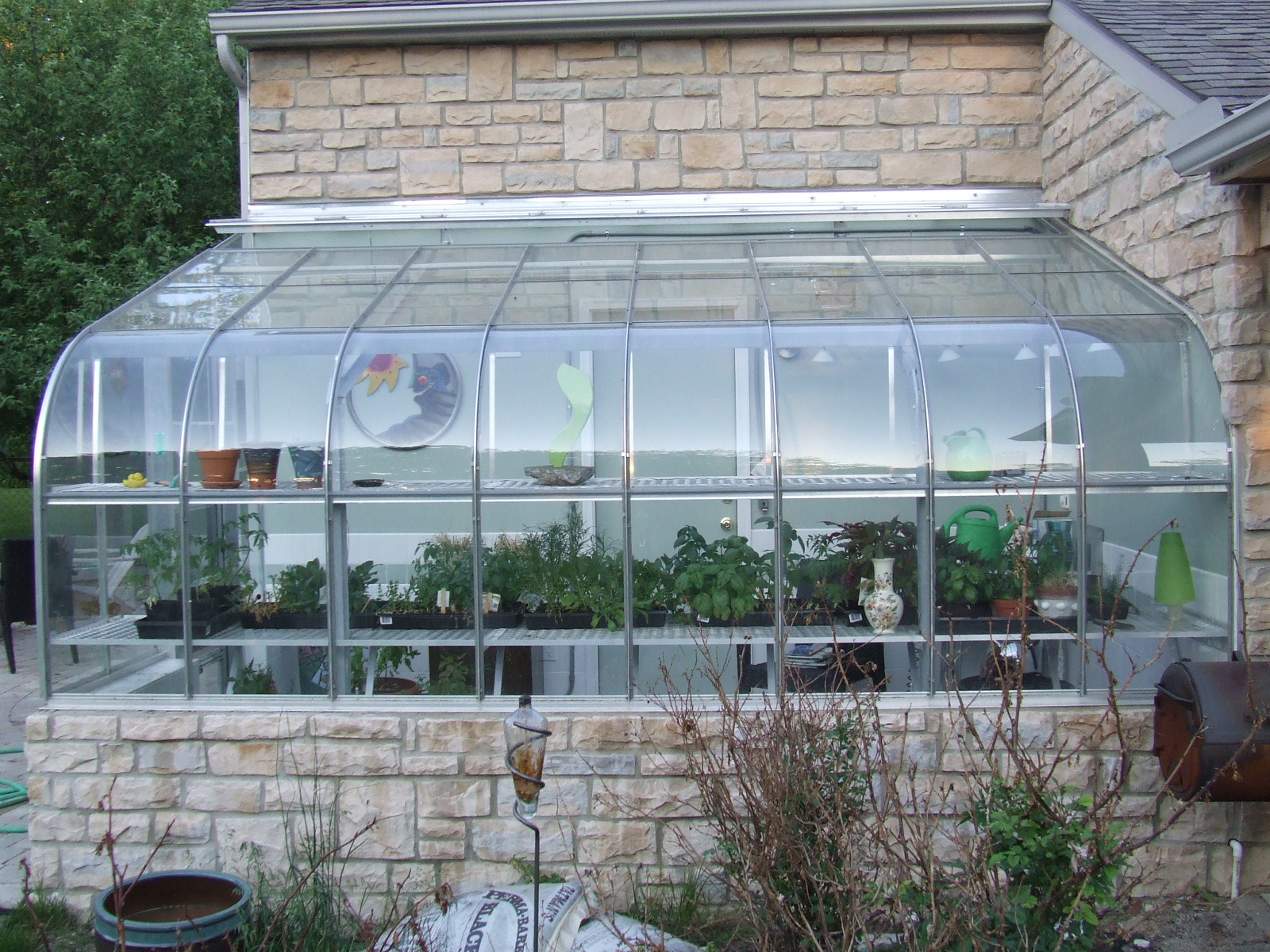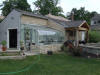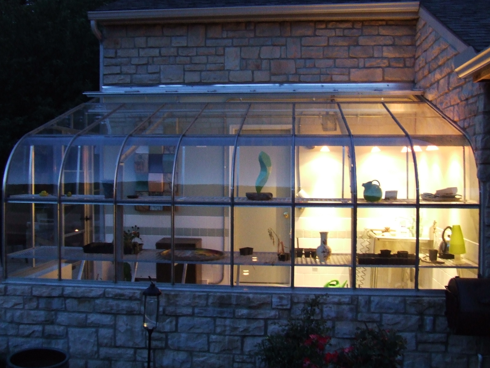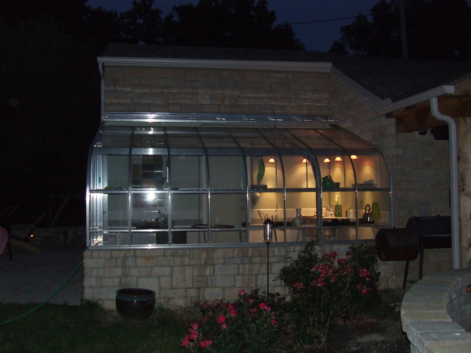 | These photos show several different angles on the completed greenhouse/garage addition, some shots of the greenhouse at night with some of the interior lighting and some of the artwork we have used to decorate the greenhouse. There are also a few photos at the end of the completed cooking area established as part of this project. |