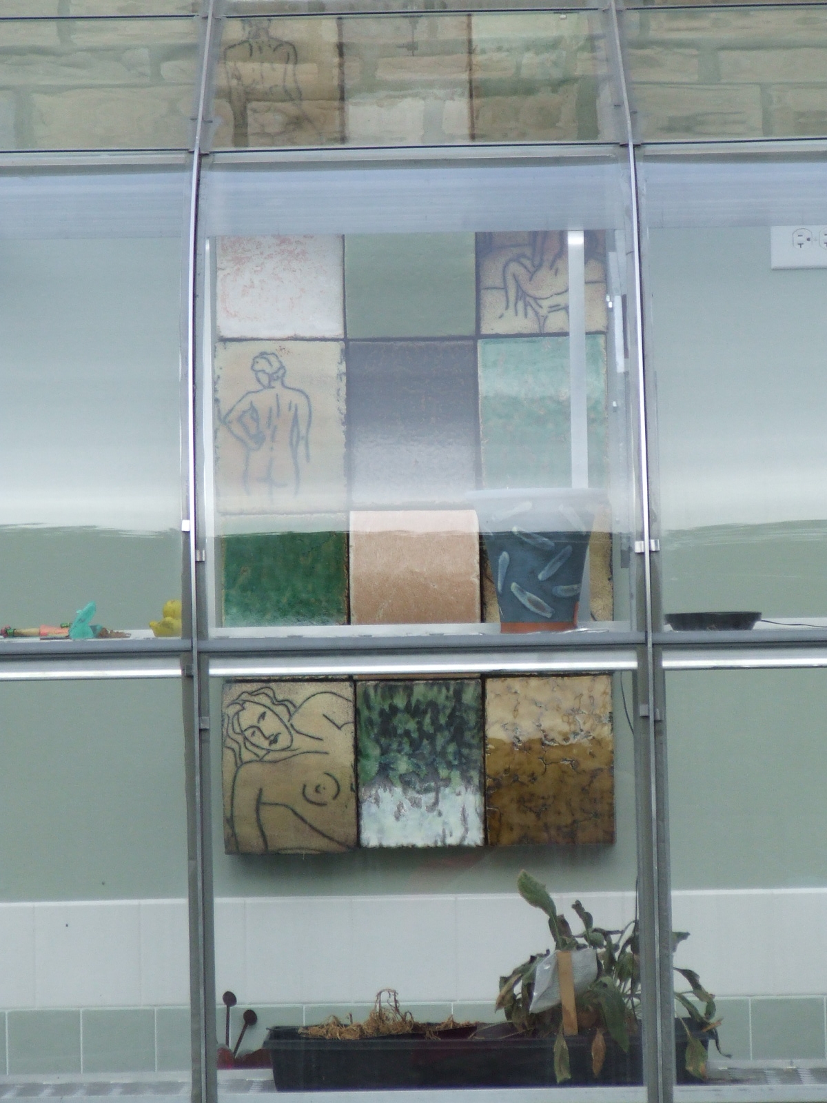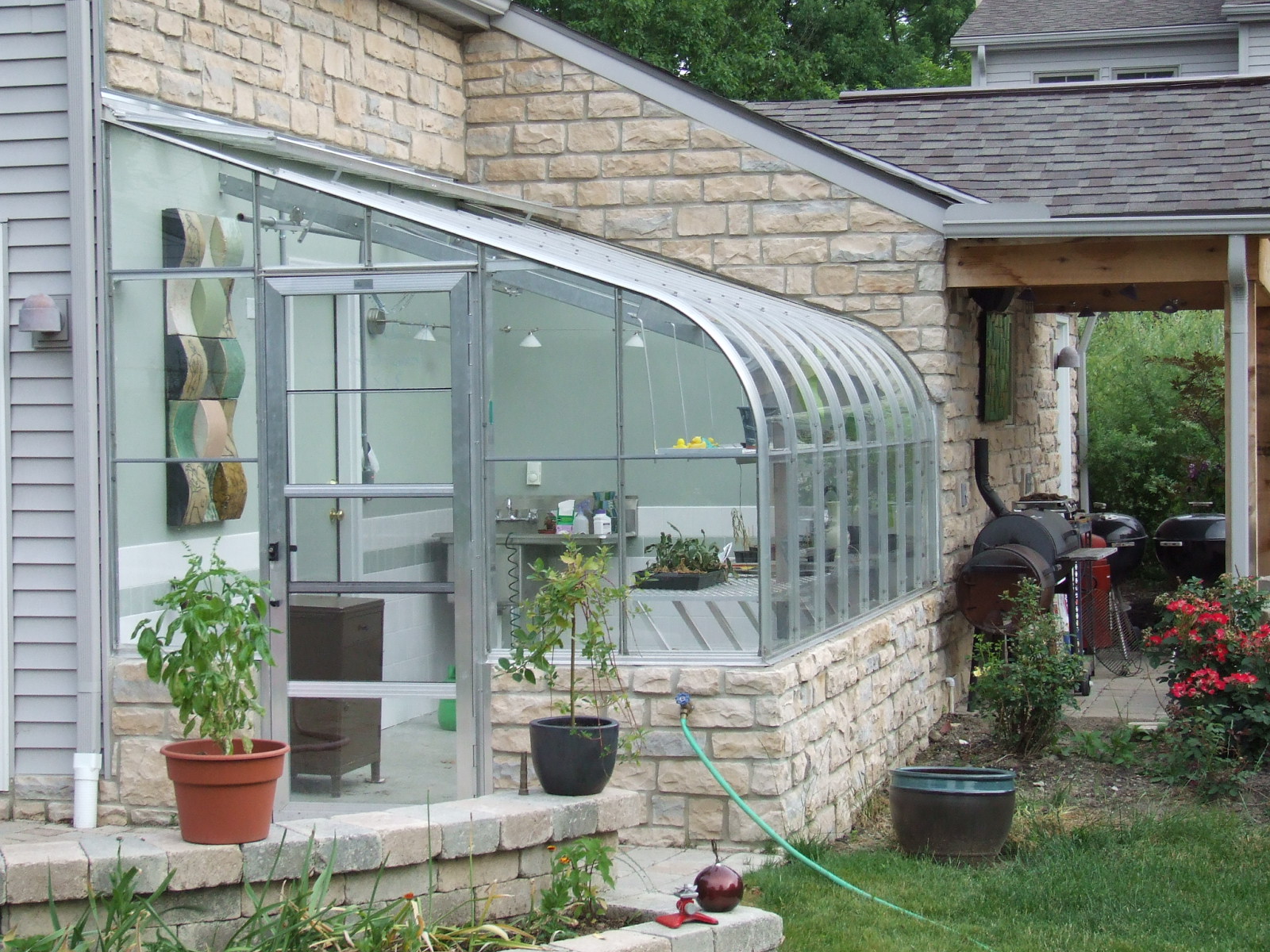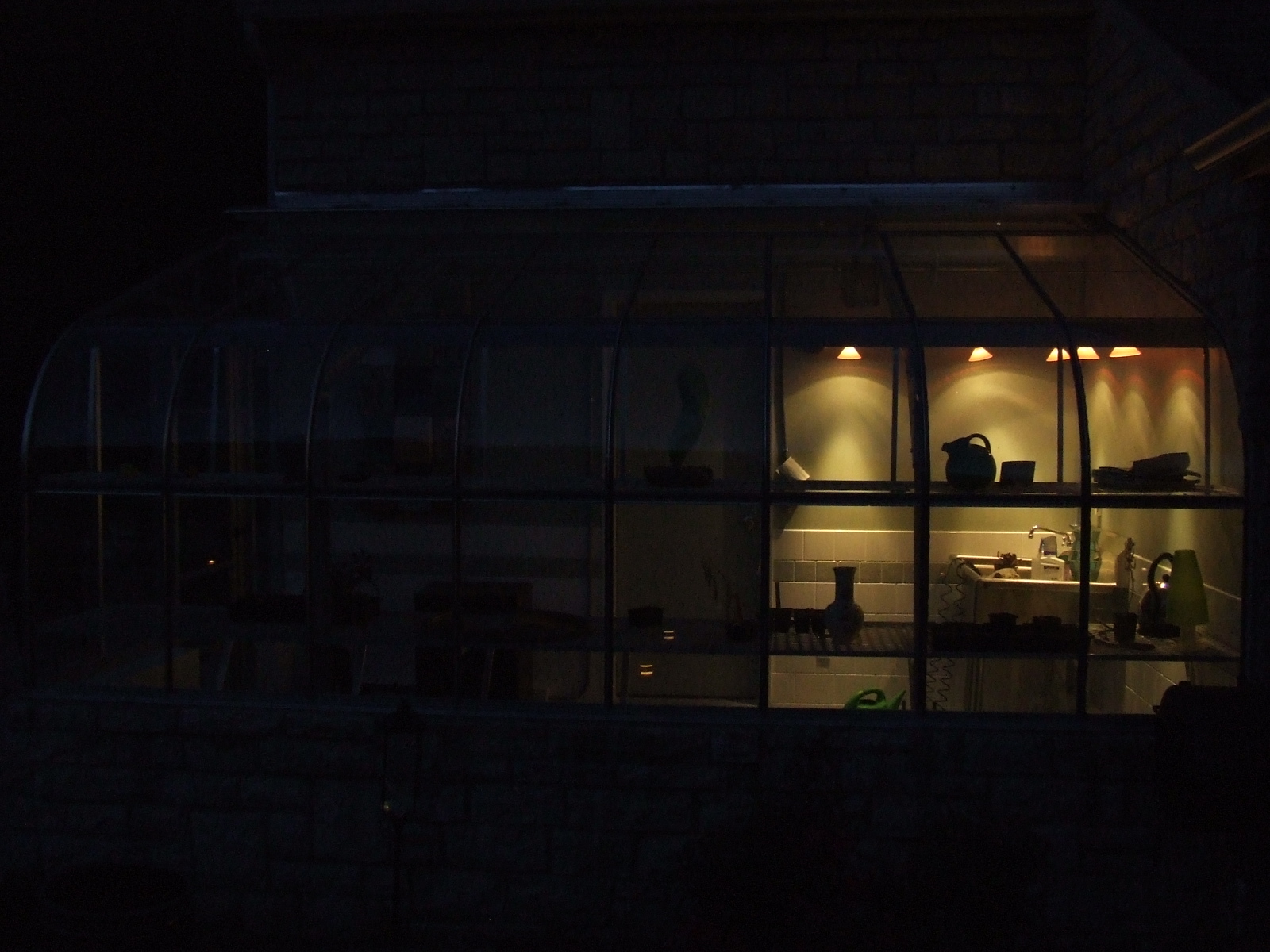 | These photos show several different angles on the completed greenhouse/garage addition, some shots of the greenhouse at night with some of the interior lighting and some of the artwork we have used to decorate the greenhouse. There are also a few photos at the end of the completed cooking area established as part of this project. |