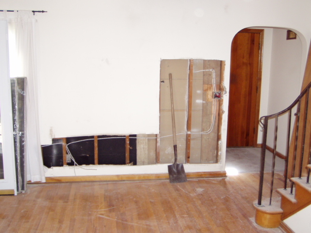 Cut-outs in the living room to run some wiring; it doesn't look like there is insulation in that outside wall! |
