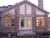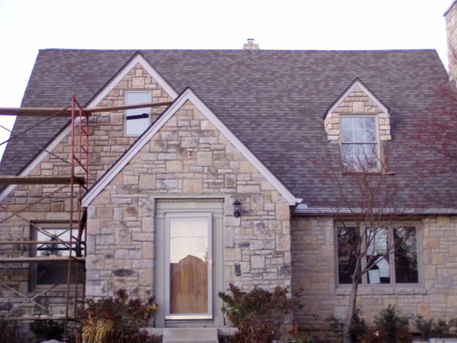 November 19: Dodging the raindrops again, the stone front of the house is built to match the old facade.
