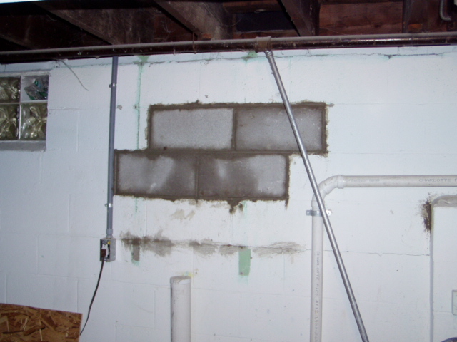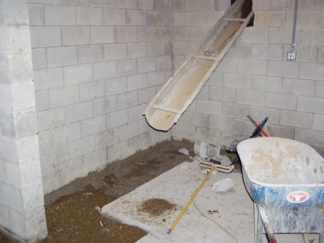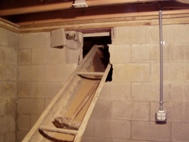 Later in the week, they punched a hole in the basement wall to bring in materials for the floor. |