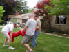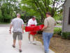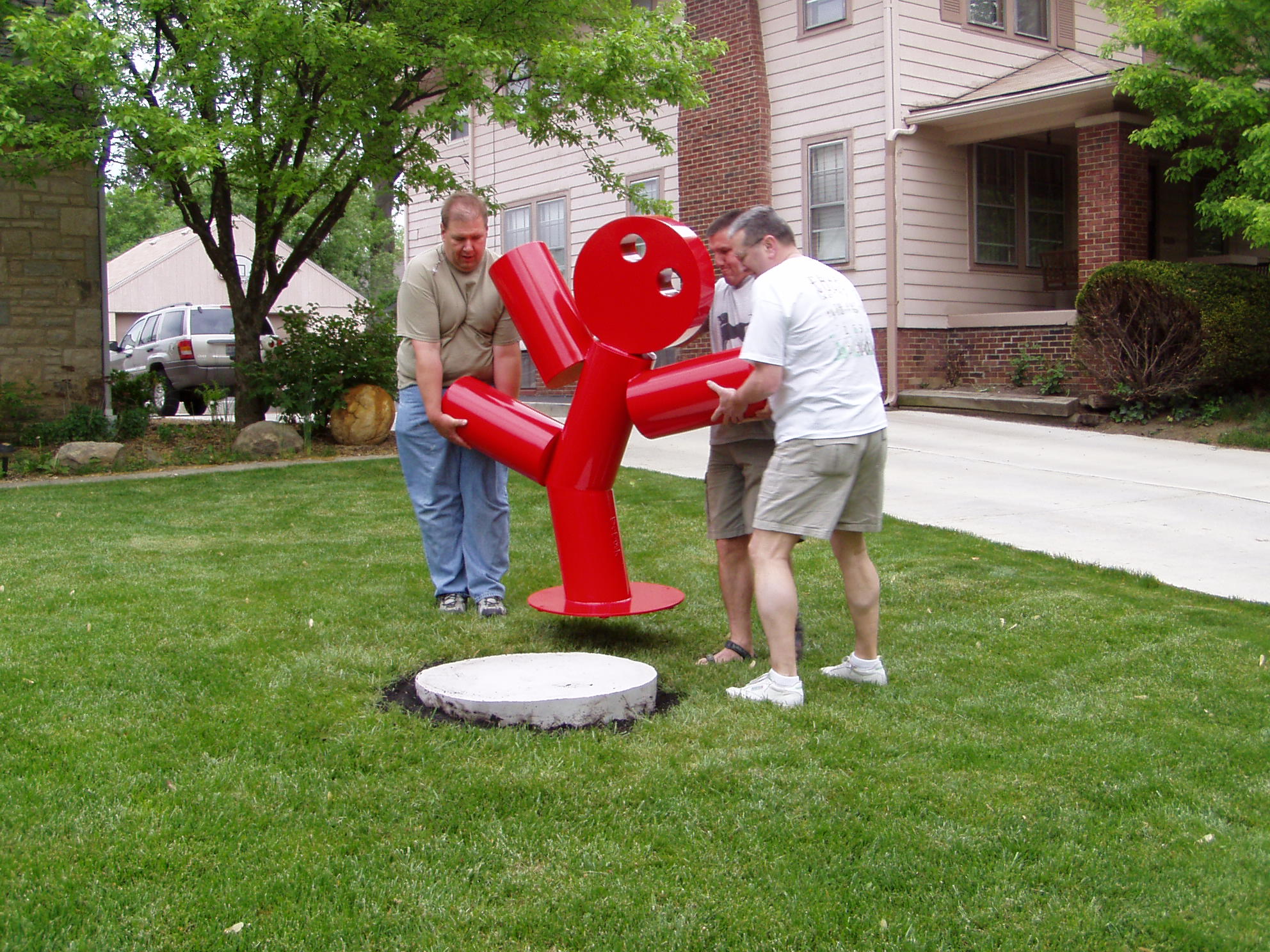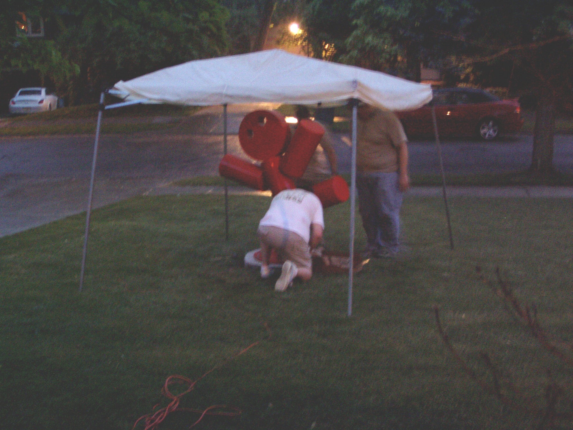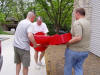"Uncle Kirk," on the left, and "Grandpa," Bill Radford (center, facing camera) were the engineering brains behind providing a secure base for Fat Happy. On May 14, 2005, Grandpa and Uncle Kirk came to finish the job and help me secure Fat Happy in his permanent location. |