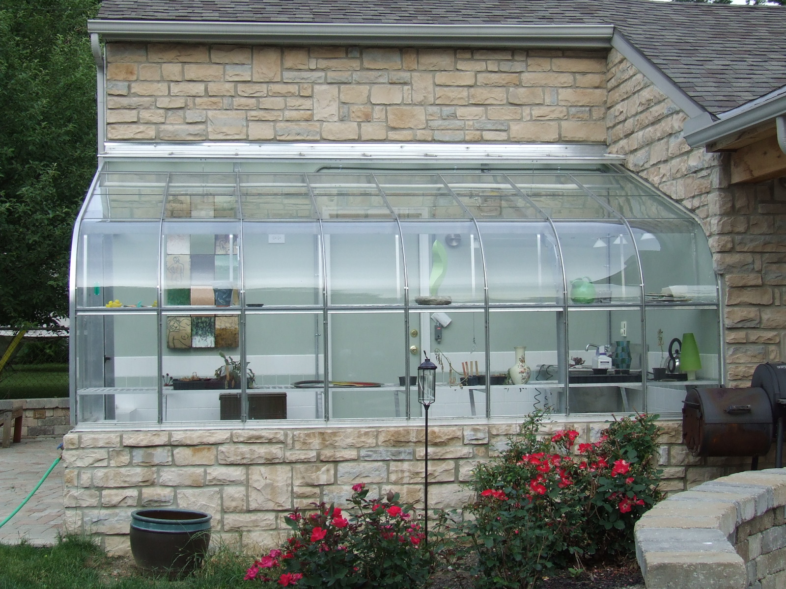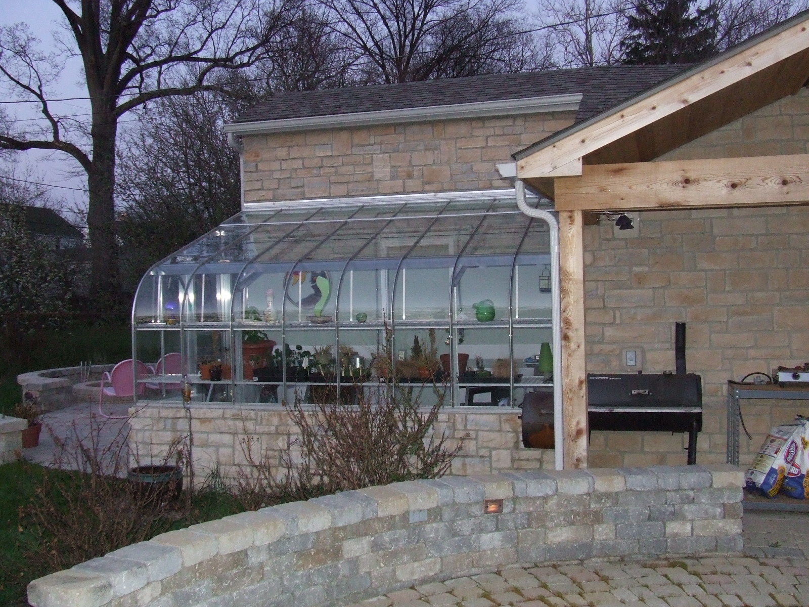 | These photos show several different angles on the completed greenhouse/garage addition, some shots of the greenhouse at night with some of the interior lighting and some of the artwork we have used to decorate the greenhouse. There are also a few photos at the end of the completed cooking area established as part of this project. |