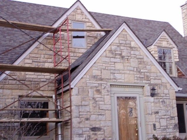November 19: Dodging the raindrops again, the stone front of the house is built to match the old facade.